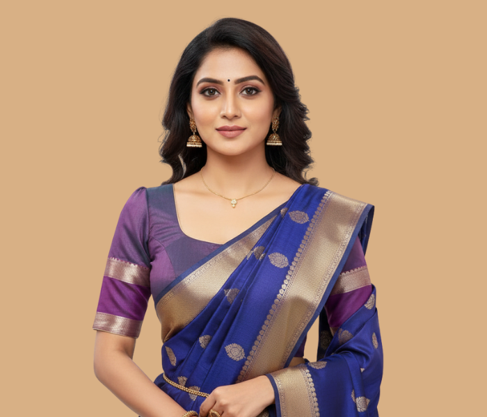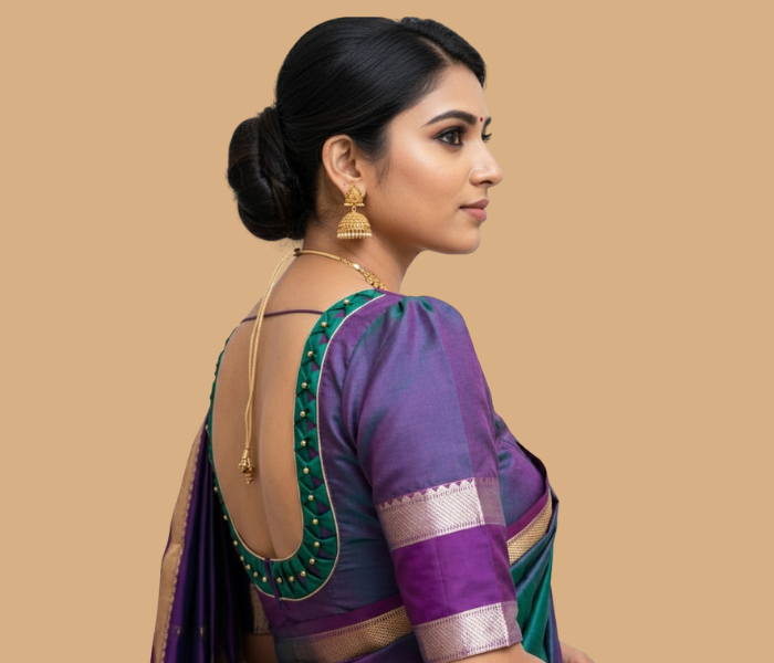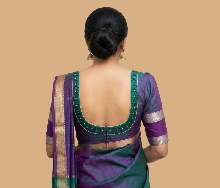 An elegant double-shaded purple blouse with intricate zari work and a wide neckline, perfect for elevating festive and silk saree looks.