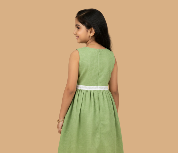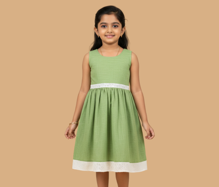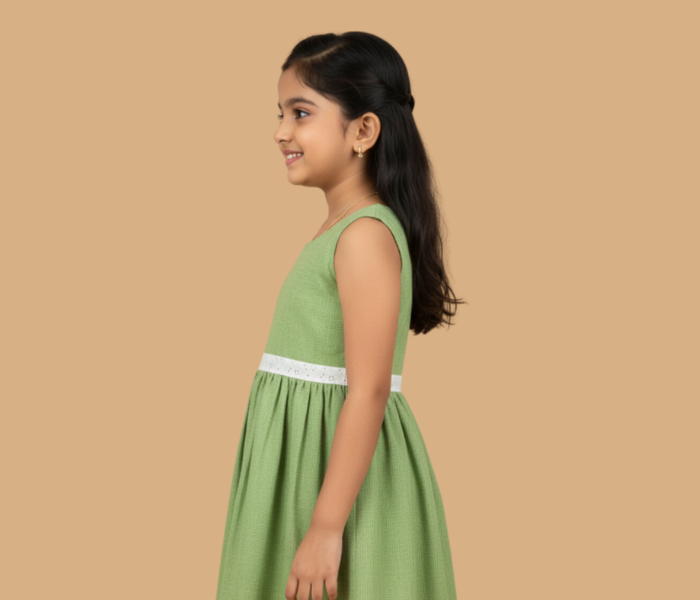 Sleeveless pastel green cotton dress with elegant white lace detailing along the edges and a white lace belt that highlights the waist. Crafted from soft, breathable cotton for everyday comfort.