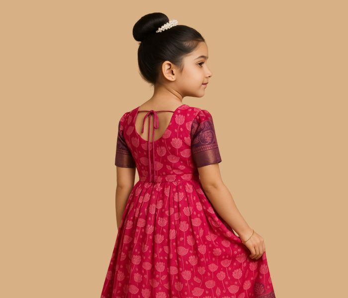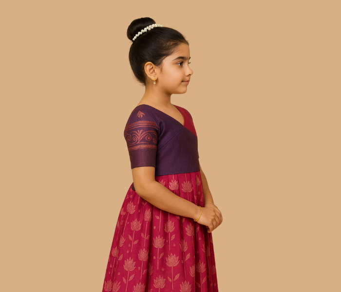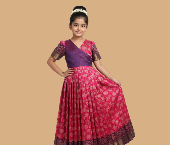 Exquisite purple and pink silk Anarkali set, featuring rich sari borders and a beautifully crafted multi-panelled silhouette for a flawless fit. Elegant, timeless, and designed to make a statement — perfect for any occasion.