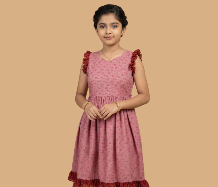 Adorable red and pink frock featuring playful ruffled sleeves and a layered ruffle hem that adds movement and charm. Crafted for comfort and style, this cheerful outfit is perfect for a fun summer outing or any casual day in the sun.